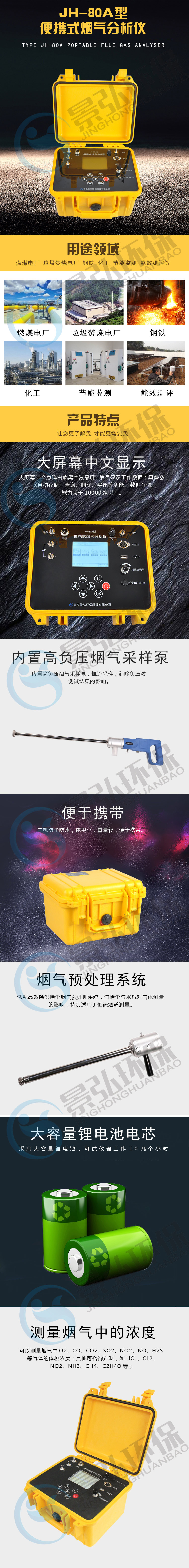 JH-80A型便攜式煙氣分析儀主要采用NDIR非分光紅外和電化學技術(shù),用于直接測量煙氣中的O2、CO、CO2、SO2、NO2、NO、H2S等氣體的濃度(其他可咨詢定制,如HCL、CL2、NO2、NH3、CH4、C2H4O等)。配套測溫一體化采樣槍,同時測量煙氣溫度、煙氣壓力及流速等參數(shù)。該產(chǎn)品的主要特點是精度高、體積小、攜帶方便、操作簡單,主要應(yīng)用于燃煤電廠、垃圾焚燒電廠、鋼鐵、化工、節(jié)能監(jiān)測、能效測評、燃燒研究等領(lǐng)域。