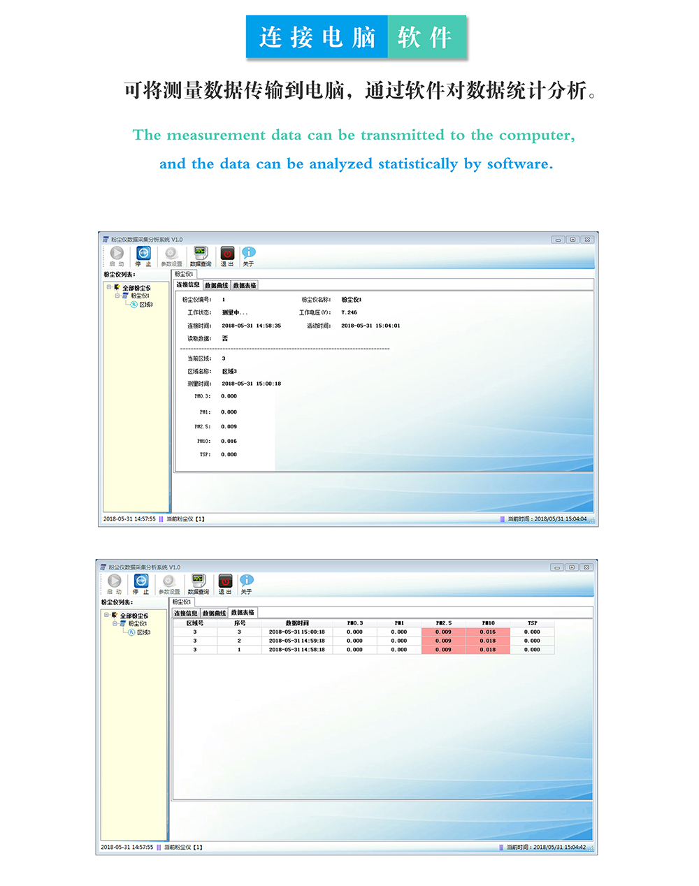為提高產(chǎn)品的性價比,PC-3A(S)升*版呼吸性激光粉塵檢測儀免費配套專業(yè)的數(shù)據(jù)采集分析軟件,該分析軟件可以實時的數(shù)據(jù)采集,支持邊檢測邊畫數(shù)據(jù)曲線;具備表格與曲線顯示兩種數(shù)據(jù)查詢模式;通過電腦來啟動與停止粉塵儀監(jiān)測,讀取讀取粉塵儀監(jiān)測的數(shù)據(jù)數(shù)據(jù);自動計算監(jiān)測數(shù)據(jù)的*大值、*小值、平均值;支持多臺粉塵儀同時在線監(jiān)測;支持無線數(shù)據(jù)采集(選配);