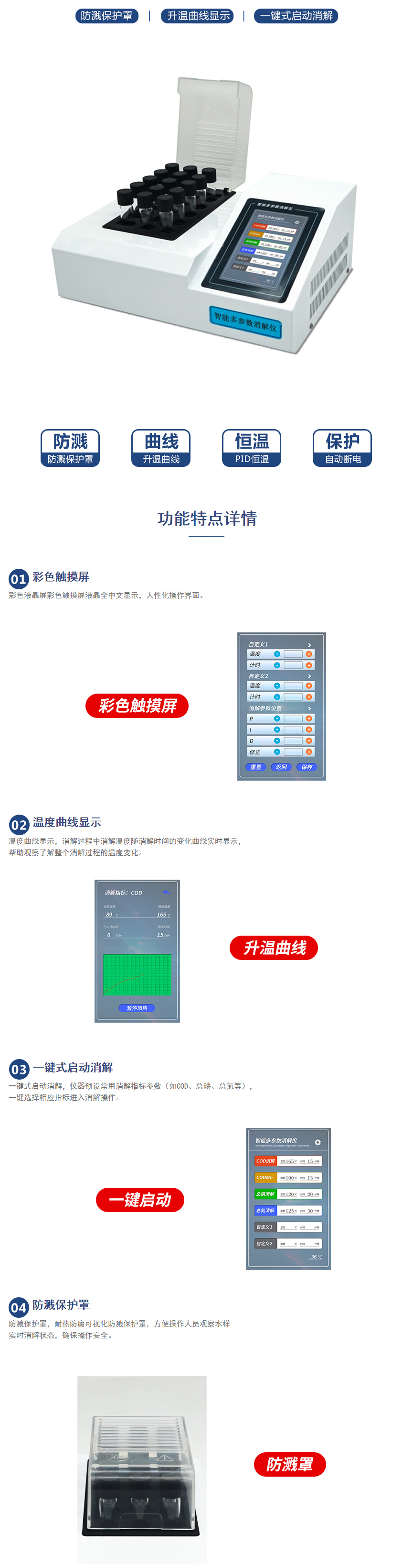 3.防濺保護(hù)罩,耐熱防腐可視化防濺保護(hù)罩,方便操作人員觀察水樣實(shí)時(shí)消解狀態(tài),確保操作安全。