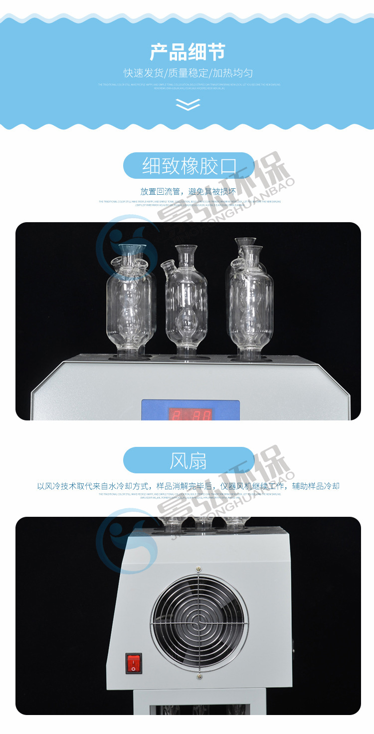 儀器采用微機(jī)技術(shù)進(jìn)行定時(shí)控制加熱電爐,可對6個(gè)消解器瓶回流裝置同時(shí)進(jìn)行加熱。從而達(dá)到節(jié)能增效的目的。 該儀器采用玻璃玻璃毛刺回流管代替球形回流管,并以風(fēng)冷技術(shù)取代水冷,從而提高儀器的穩(wěn)定性和安全性。