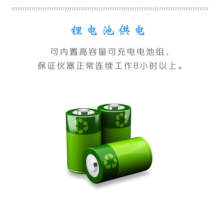 2、可內(nèi)置高容量可充電電池組,保證儀器正常連續(xù)工作8小時(shí)以上,交、直流兩用。