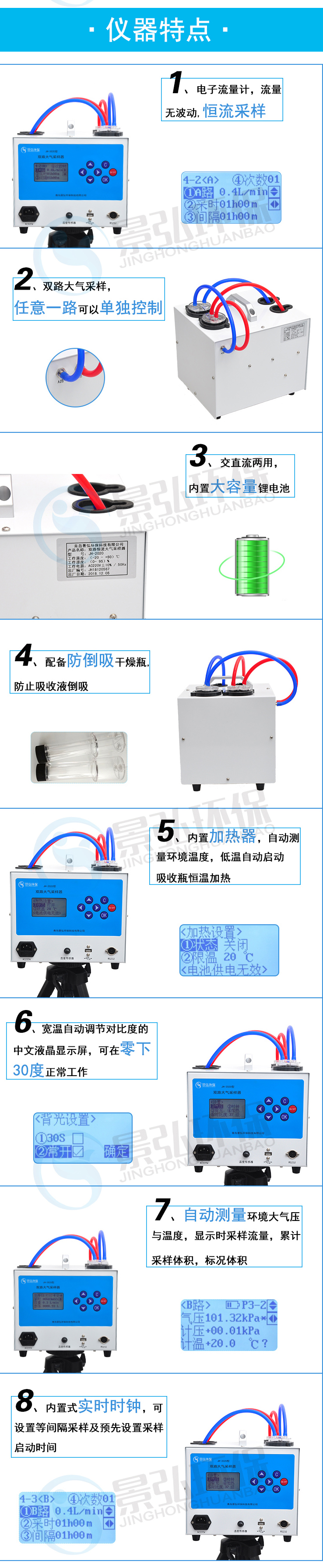 10、自動(dòng)測(cè)量環(huán)境大氣壓與溫度,顯示實(shí)時(shí)采樣流量,累計(jì)采樣體積,標(biāo)況體積;
