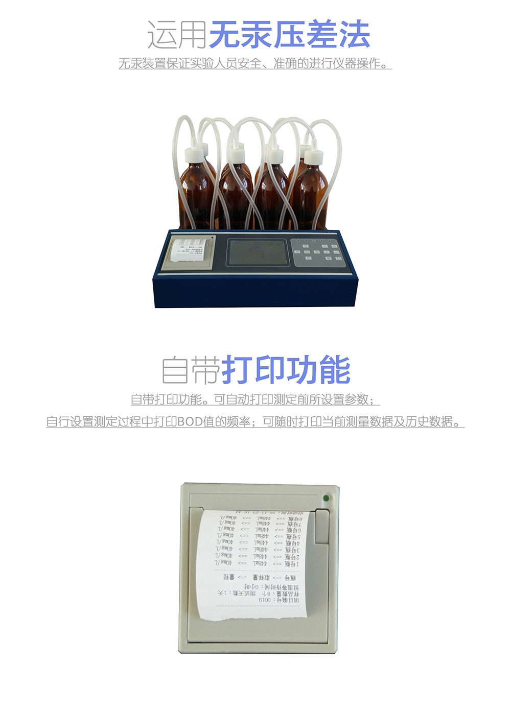 3、 自帶打印功能。可自動打印測定前所設(shè)置參數(shù);自行設(shè)置測定過程中打印BOD值的頻率;可隨時打印當(dāng)前測量數(shù)據(jù)及歷史數(shù)據(jù)。