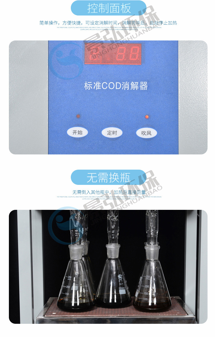 儀器的化學(xué)溶液配制、操作和COD的計(jì)算遵照GB11914-89,低于50mg/L的COD水樣可通過稀釋滴定劑和氧化劑來提高精確度,高于1000mg/L的COD水樣,可通過水樣的比例稀釋來完成測定。